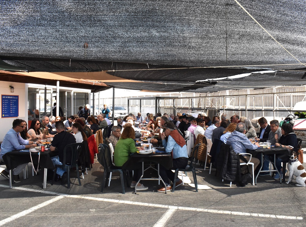 La comida se celebró en la explanada de la zona deportiva, donde los asistentes fueron recibidos con un tentempié y Vermut Miró, para después entablarse y saborear los entrantes del Barlovento y los fideos de la Cofradía de Pescadores. Una vez finalizado, participaron en la asamblea ordinaria de socios.